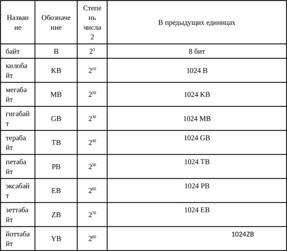 Широко используются еще более крупные производные единицы информации. Старшие производные единицы представляют собой соответствующие степени основания числа 2, названия их формируются по общим принципам формирования названий единиц (приставки кило, мега, гига и т.д.), при этом проявляется несоответствие «десятичных приставок» и степени основания.