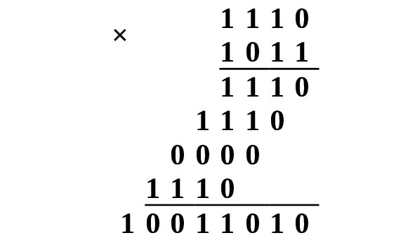 Умножение. Умножение двоичных чисел, также схоже на умножение десятичных. Вот пример умножения двоичных чисел столбиком.