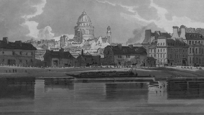 Нас спросили, не везем ли мы чего, подлежащего городской пошлине, то есть съестных припасов, вин и т. п. Отрицательный ответ кондуктора отворил свободный въезд в ворота… Так вот я и в Париже! Направо увидел я великолепное здание, примыкающее к заставе. Это водохранилище Вильетское, звено, соединяющее каналы Сен-Дени и Сен-Мартен, посредством которых лука, описываемая Сеною под Парижем, значительно сокращается для судоходства, пристань знаменитого канала Урк, и запас вод для столицы. Парижане, для которых нет полезного без приятного, летом сбираются сюда на купанье, а зимой кататься на коньках. Влево возвышалась на отдаленном горизонте какая-то огромная церковь; после узнал я, что это был знаменитый Пантеон.