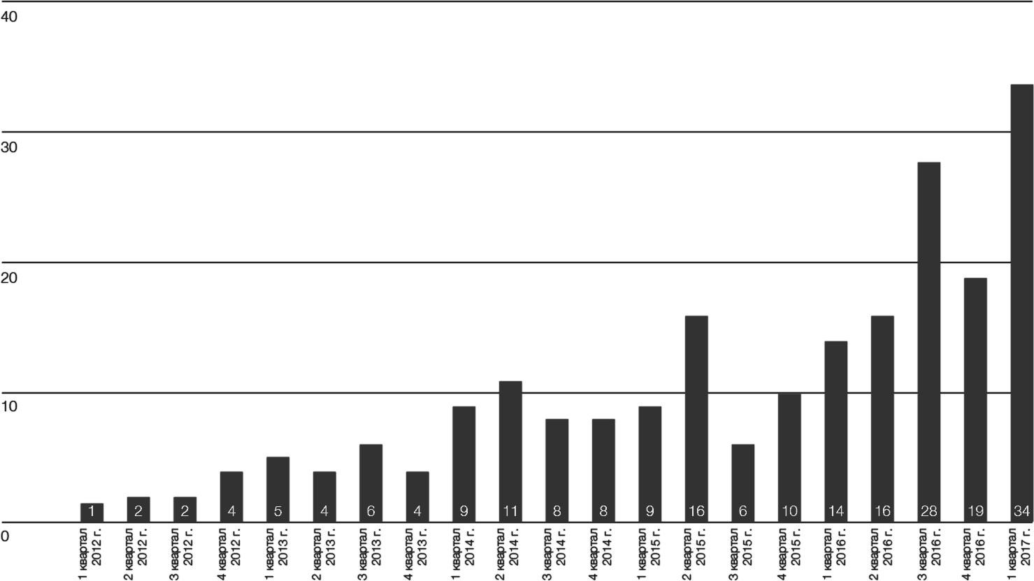 Рисунок 4. Слияния и поглощения компаний, занимающихся разработками в области искусственного интеллекта по состоянию на март 2017 г.