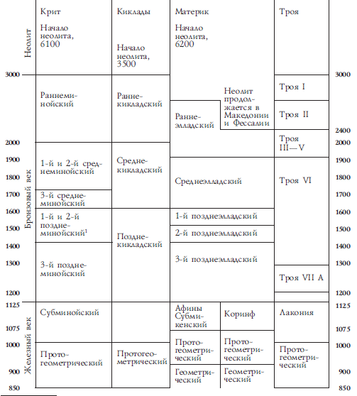 Чтобы связать всю структуру археологических находок с нашей хронологией, используют письменные источники Египта, Вавилона и Малой Азии, содержащие списки царей с указанием годов правления, которые можно перевести в нашу систему летоисчисления. Так, известно, что Аменхотеп III правил в Египте в 1412–1376 гг. Печати и скарабеи его супруги, царицы Ти, найдены на Крите среди посуды 2-го позднеминойского периода и в Микенах среди посуды 3-го позднеэлладского периода. Следовательно (принимая во внимание и другие факты), переход от 2-го позднеминойского к 3-му позднеминойскому и от 2-го позднеэлладского к 3-му позднеэлладскому периодам относится приблизительно к 1400 г. Подобные предметы ближневосточного происхождения и, соответственно, эгейские предметы, найденные в странах Ближнего Востока, являются связующими звеньями в хронологической структуре. Их наличие на Крите в минойский период позволяет осуществить достаточно надежную хронологическую привязку, но из-за того, что они редко встречаются на материке, особенно на севере, хронология древнейших периодов этих областей остается неясной. Когда они отсутствуют, например в ранний железный век, мы получаем группу нечетко привязанных друг к другу региональных цивилизаций без какого-либо указания на их место на хронологической шкале. В подобных ситуациях иногда прибегают к стилистическим критериям в предположении, что развитие стилей тоже поддается датировке. Но это неизбежно увеличивает вероятность ошибки. Она может быть уменьшена лишь благодаря новейшим методам. Один из них, радиоуглеродный, основанный на измерении доли радиоактивного изотопа углерода C14 в дереве при известной скорости уменьшения этой доли, позволяет провести абсолютную датировку, но, однако же, не со стопроцентной точностью. Такая точность никогда не будет достигнута. Выше приведена сводная таблица хронологии Греции по современным представлениям. Все даты в ней более или менее условны и отнюдь не являются общепризнанными.