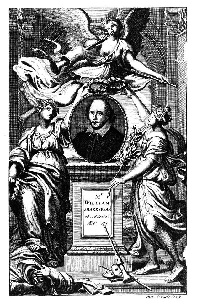 Фронтиспис, использованный для каждого из томов издания пьес Шекспира, составленного Роу. Эта копия фронтисписа из издания произведений Корнеля, в которой бюст французского драматурга заменен версией чандосовского портрета, изображает летящую над поэтом Славу и коронующих его Трагедию и Комедию.