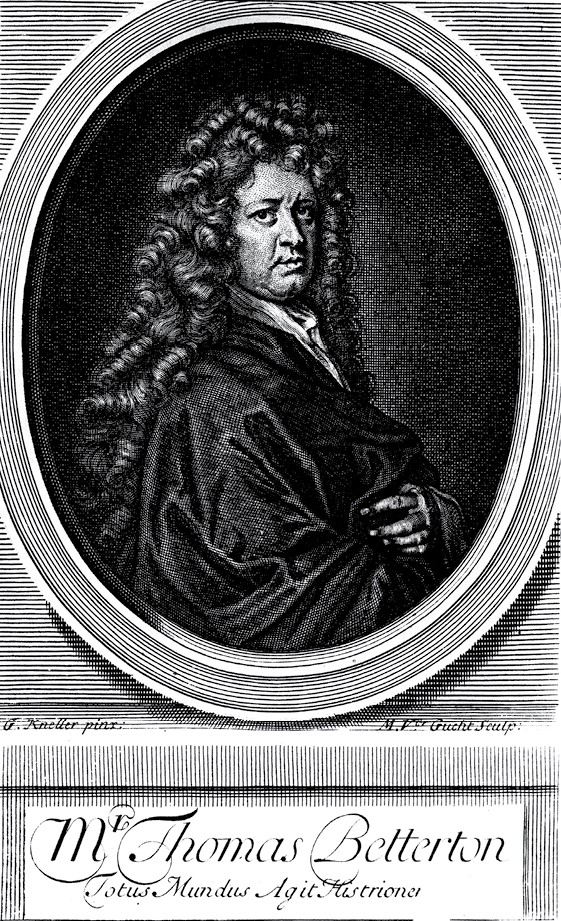 Гравированный портрет Томаса Беттертона, выполненный Михаэлем ван дер Гухтом с портрета кисти Неллера и использовавшийся в качестве фронтисписа к «Жизнеописанию Беттертона Чарльза Гилдона» (1710). Латинская фраза, которая переводится как «Весь мир – театр», считается девизом «Глобуса»