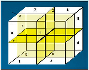 Каждый из кубов имеет (по смежным плоскостям) по три смежных пространства.
