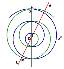Если точка M будет двигаться по прямой UV из отрицательных значений через центр вращения O и далее в положительные значения, вдоль прямой UV, то точка M опишет обе ветви спирали. Число a – называется шагом спирали