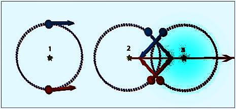 Инерция момента вращения в варианте 2 должна двинуть центр вращения в направлении оси (показана стрелкой). Противоположная позиция рисунка – 3 не сможет вернуть его назад только потому, что он уже имеет некий момент поступательного движения. Центростремительное противодействие только затормозит это движение. Поэтому центр вращения системы будет ускоренно, рывками, продолжать двигаться в первоначально спонтанно избранном направлении, при каждом последующем витке. Это уже доказано физическими опытами с твердыми телами, теоретическая неопределенность центров масс которых не идет ни в какое сравнение с динамикой вращения жидкостей или газа.