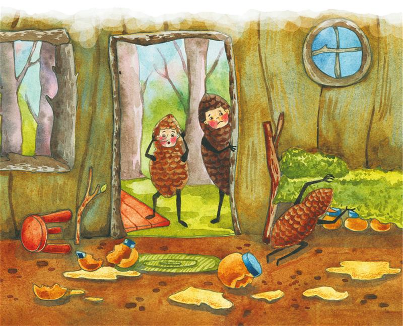 Наутро Сигизмунд, Кеша и Гоша побежали к своим домикам, чтобы проверить, как дела. После быстрого перехода короткой тропой друзья оказались на своей поляне. К сожалению, опасения Сигизмунда полностью оправдались… Двери его домика, а также домиков Гоши и Тоши были сорваны и валялись рядом. Внутри домиков царил полный беспорядок: мох с кроваток разбросан, разбиты горшочки для мёда, черепки от них валялись на полу. Все запасы мёда, хранившиеся на полочках, пропали. К счастью, воришки не догадались посмотреть под кроватки, где также были запасы мёда, не поместившиеся на полках.
