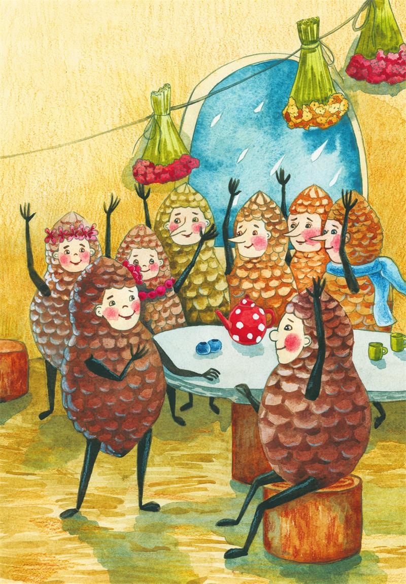 Идея нашла своё полное одобрение как среди шишков, так и среди шишечек. А поскольку слова у наших друзей не расходились с делами, дом был построен за три дня и украшен как снаружи, так и изнутри. Внутри дома поместился большой стол, стулья по числу друзей, полочки для мёда, чайничков с чашками и душистых трав. Девочки приносили полевые и лесные цветы, расставляя букетики в разные места. Получилось очень уютно и красиво. Спустя короткое время друзья убедились в правильности и своевременности своего решения.