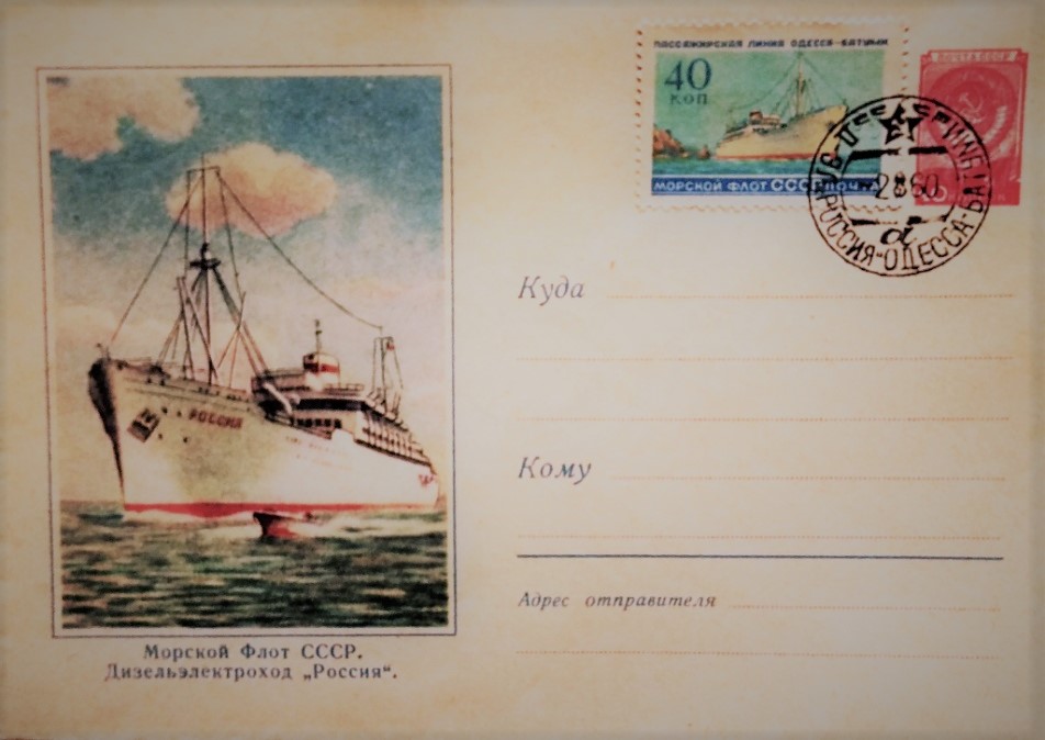В 50-ые годы дизельэлектроход «Россия» был флагманом Крымско-Кавказской линии. Конверт 1955 г., издание Министерства связи СССР.