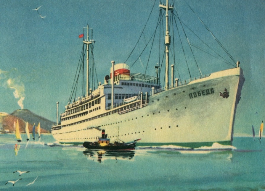 Теплоход «Победа», на котором советские туристы совершили первый круизный рейс в июне 1956 г вокруг Европы. Открытка, издание 1958 г. по заказу МФ СССР.