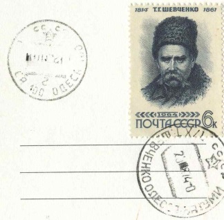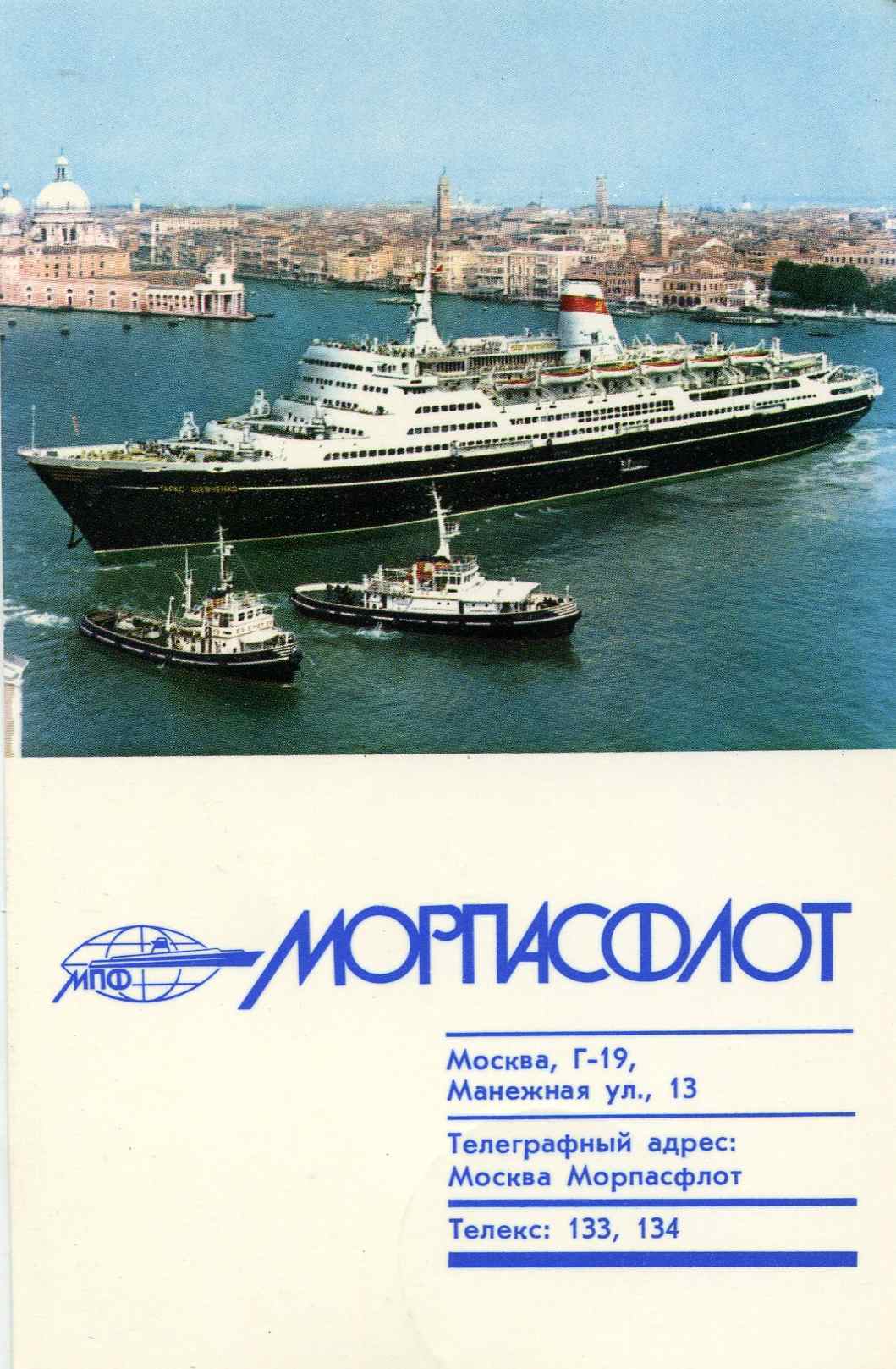 Теплоход «Тарас Шевченко» в Венеции. Рекламная открытка МПФ, изданная, судя по почтовому штемпелю не позже 1974 года.