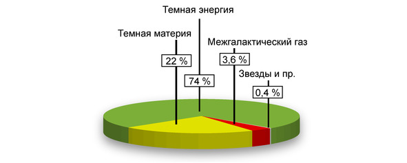 А то, что это не шутки современной физики, подтверждает диаграмма энергоемкости окружающего нас Космоса. В ней все звездные скопления и межгалактический газ составляют всего-навсего 4%. Всё остальное темная энергия и темная масса. Темная материя тоже очень спекулятивна. «Духи галактик», их невозможно обозвать по-другому, – это объекты, которые мы видим оптически и ощущаем гравитационно. Гравитационное влияние ныне живущих галактик равно единице; а влияние «духов» равно K-1 = 0.97931758.