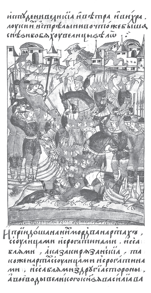 Однако поспать ему в это утро так и не пришлось. В лагерь примчался гонец с известием о том, что татары уже совсем близко и вброд переправляются через речку Нерль. Вновь, как и в памятной битве с Василием Косым под Ростовом, Василий II стал в суматохе отдавать приказы и натягивать на себя многочисленные доспехи. К счастью, московские воеводы знали свое дело. Стряхнув остатки вчерашнего хмеля, они успели до появления татар выстроить полки и приготовиться к бою. Первый натиск «поганых» был отбит. Но тут татары применили свой любимый прием – притворное отступление. Отсутствие единоначалия и твердой дисциплины в разнородном московском войске привело к тому, что часть ратников кинулась преследовать бегущих, а другая часть осталась собирать трофеи и торжествовать победу. Между тем татары неожиданно остановились и, развернувшись, ударили на москвичей. Не ожидавшие такого поворота событий, русские воины дрогнули и обратились в бегство.