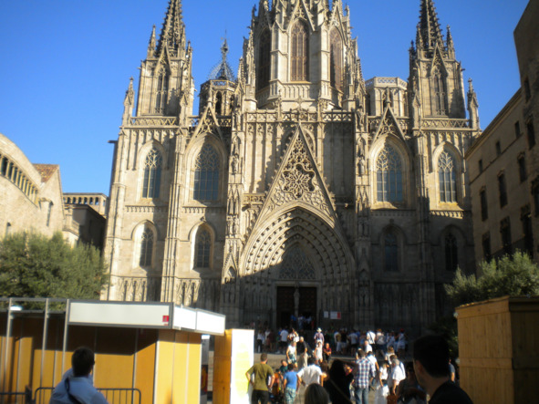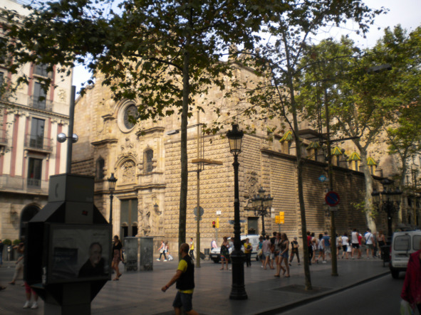 Мы прибыли в Барселону поздно вечером, развозка из аэропорта где-то в 21.30 выкинула нас на Плаза ди Каталуния, а уже в 22.00 мы, успев проскочить с добрые полтора километра по ночным Рамблас и наскоро швырнув вещи в гостинице, вылетели посмотреть на долгожданное чудо. Гостиницу в плане расположения я в этот раз выбрал очень удачно – она находилась в самой середине Рамблас, в равной удаленности и от набережной, и от Плаза ди Каталуния, пятьдесят метров от самих Рамблас в глубь Эль-Раваль, по узенькому, застроенному трех и четырех этажными домами 18 века, и совсем недалеко от легендарного рынка Старой Барселоны «Ла Бокерия», куда уже на следующее утро нас конечно же, в первую очередь понесли ноги. Двери гостиницы упирались в артистический подъезд знаменитой барселонской Оперы «Лицео», а когда мы проходили из нашего переулка к Рамблас, то неизменно попадали на небольшую площадь перед входом в оперу, которая с противоположной стороны – там, откуда заходишь в кварталы Старой Барселоны – обрамлялась полусферой из нескольких зданий совершенно необычного по стилю концептуального декора. Над самими этими строениями, в утренние часы особенно загадочно и заманчиво, парили шпили Кафедрального собора и еще нескольких готических церквей 14 века по дороге к нему. И стоило лишь взглянуть на них, как предвкушение развернувшегося где-то вокруг них и ждущего встречи, обещающего массу откровений и впечатлений чуда, немедленно и властно заливало душу сладостным трепетом. И поскольку выходить сюда мы были вынуждены по нескольку раз в день, и вид всякий раз восхищал глаз, снимки этого места постоянно попадаются в выставленной здесь серии фотографий.