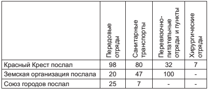 Союз городов, посылая отряды, дает, в сущности, ту же организацию. Параллельно с указанным типом существуют учреждения с превалирующим выявлением медицинской помощи, как, например, специальные хирургические отряды Красного Креста; но их немного – всего шесть; возникли они по инициативе проф. Сапежко и функционируют на Юго-Западном фронте гораздо больше перевязочно-питательных пунктов и питательных пунктов.