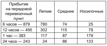 Отсутствие этой системы порождает отчасти полипрагмазии перевязок, задерживает раненых на перевязочных пунктах до 12–16 часов и вносит путаницу, при которой раненых в живот кладут в двуколку и трясут до главного перевязочного пункта, откуда на руках несут в дивизионный лазарет. Факт печальный, но, к сожалению, нередкий, как это видно из следующей таблицы.