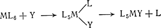 В реакциях, которые проходят по механизму замещения, скорость определяющей является бимолекулярная реакция присоединения лиганда, за которой следует быстрая диссоциация образовавшегося интермедиата: