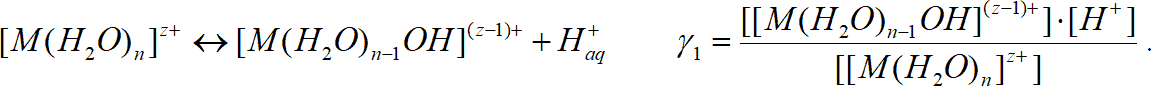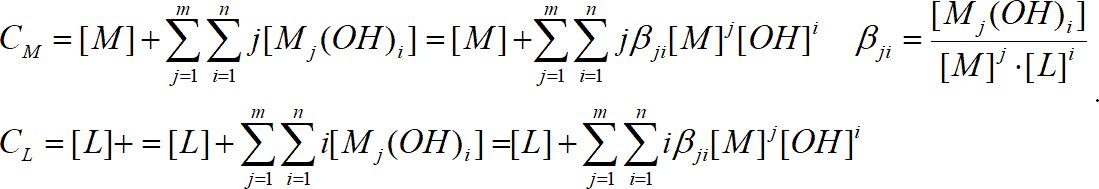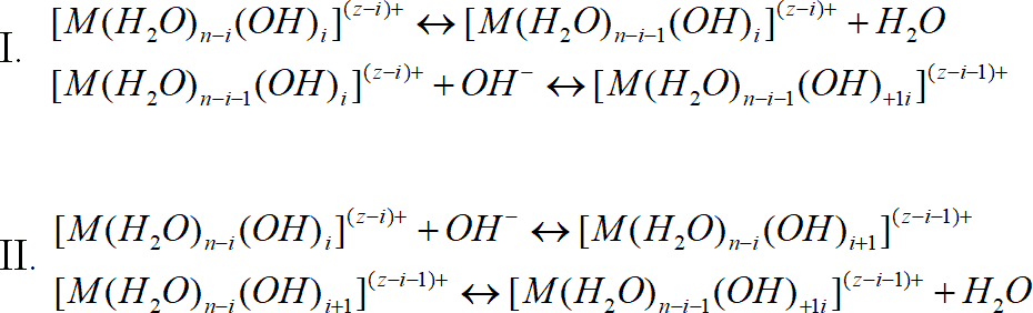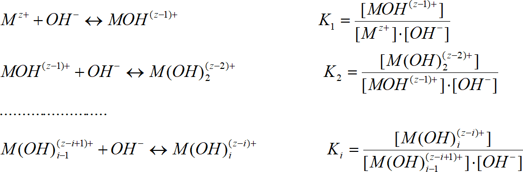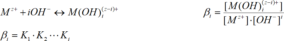 В соответствии с принципом Бьеррума процесс осуществляется ступенчато и не обязательно протекает до нейтральной формы, но предполагается образование и отрицательно заряженных форм. Каждую ступень можно охарактеризовать ступенчатой константой, а в общем виде – общей константой образования гидроксокомплексов.