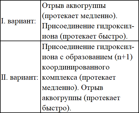 Что касается механизма, то если рассмотреть возможные пути протекания только одной реакции образования гидроксокомплексов, то можно предположить по крайней мере два независимых варианта, уже рассмотренных ранее, – реакции диссоциации и замещения.