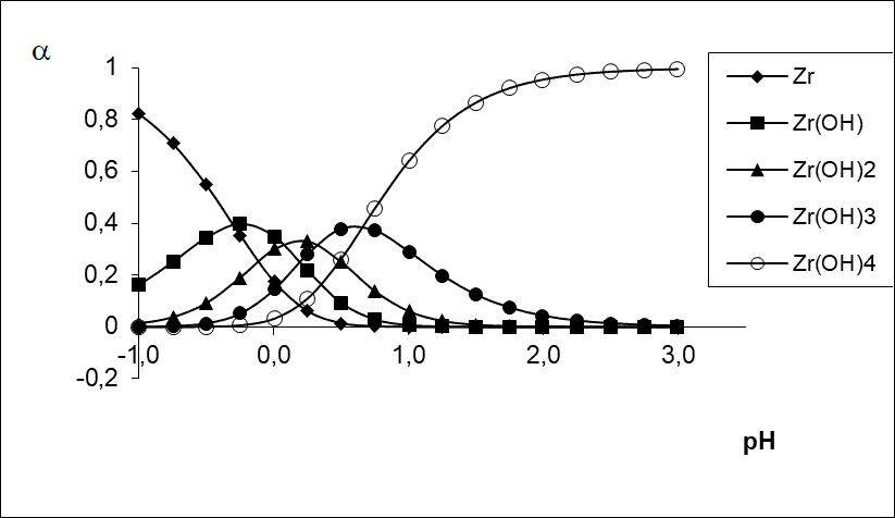 Рис. 1.7. Зависимость доли гидроксоформ Zr(IV) от рН раствора.
