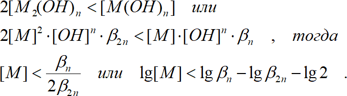 Нижний концентрационный предел, после достижения которого должны образовываться только моноядерные комплексы, зависит от общей константы устойчивости первого образующегося полиядерного комплекса (т.е. биядерного) и от общей константы устойчивости комплекса, последнего в ряду моноядерных, который имеет одинаковое с биядерным число лигандов. Чтобы концентрация моноядерного комплекса M(OH)n была выше концентрации биядерного должно выполняться следующее неравенство: