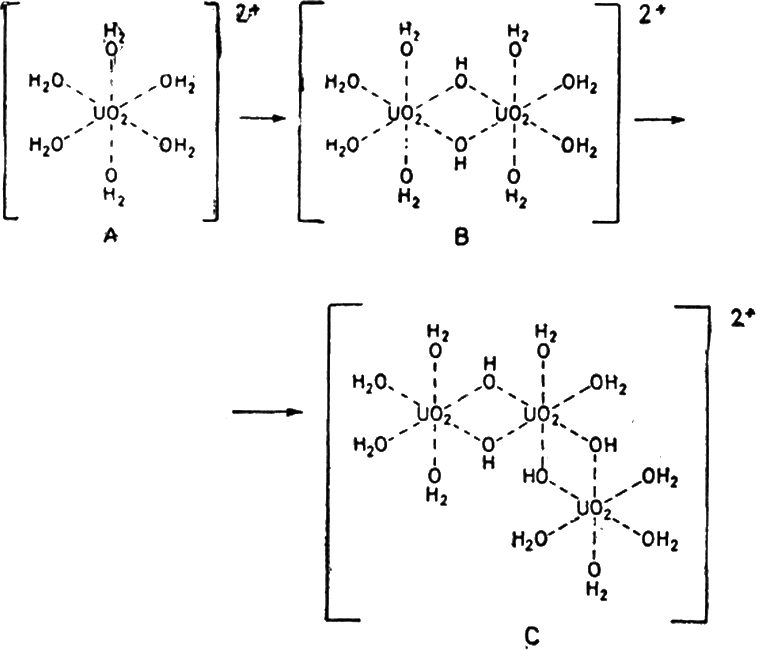 В водном растворе уран может находиться в виде катионов различного строения и заряда. Показано, что катион UO22+ устойчив и характеризуется прочной связью U–O. Кроме того, такие катионы найдены в составе твердой фазы и при различных химических реакциях в растворах остаются неизменными. Данные изотопного обмена с использованием 18О подтвердили существование в растворах катионов UO22+. В растворах, подкисленных, например, азотной или хлорной кислотой, лигандами у мономерного UO22+ служат молекулы Н2О, которые при повышении рН проявляют тенденцию к диссоциации. В некоторых системах дальнейший рост рН приводит к более глубокой диссоциации, в результате которой гидроксильный лиганд трансформируется в окисный. Мостиковые группы в полиядерных ионах ведут себя в принципе также. В ходе этого процесса соответствующим образом изменяется и заряд иона.
