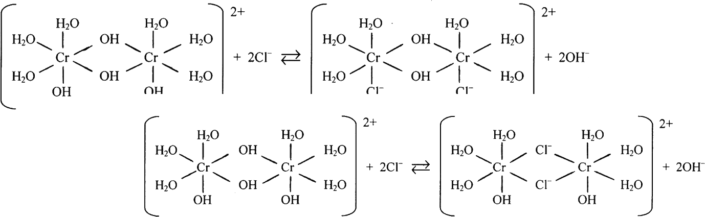 Было показано, что растворы основных солей хрома при нагревании становятся более кислыми, причем растворимость солей уменьшается. Если растворы охладить, то спустя длительное время рН раствора принимает прежнее значение. (Эффект тот же, что и прибавлении щелочи.) При этом протекает процесс оксоляции, т.е. превращение оловых групп в оксо-группы путем отщепления ионов водорода.