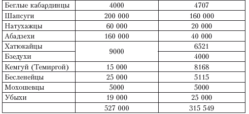 Весьма трудно точно определить численность черкесского племени: «Все цифры, которыми означали кавказское население, брались приблизительно и, можно сказать, на глаз. По понятиям горцев, считать людей было не только совершенно бесполезно, но даже грешно; почему они, где можно было, сопротивлялись народной переписи или обманывали, не имея возможности сопротивляться»[32].