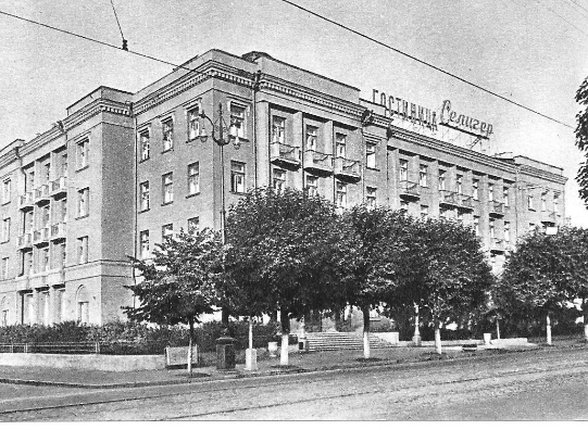 Четырёхэтажная гостиница «Селигер», серого серьёзного такого, даже чем-то сурового, цвета, и ныне находится в центре города, на Советской улице. Вход с массивными дверьми, со швейцаром. В вестибюле – прямо администратор, а направо дверь в ресторан, из которого к нашему приходу даже музыка уже доносилась, хотя ещё никто не танцевал.