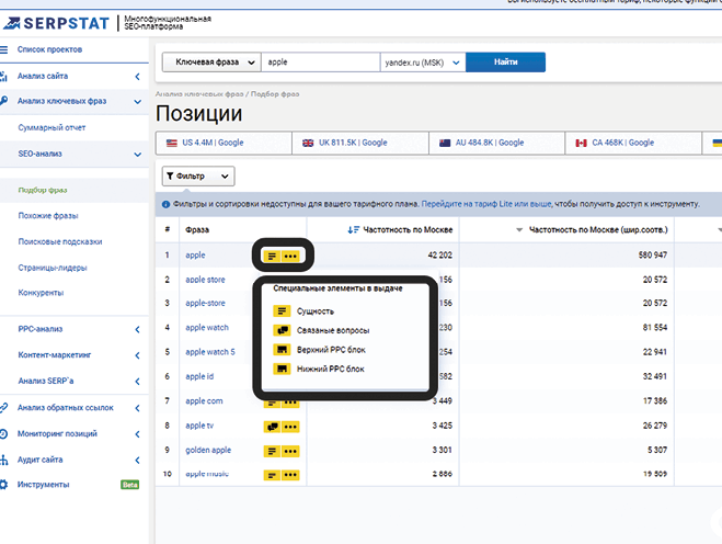 Вы можете использовать Serpstat, чтобы увидеть, какие типы «универсальных» результатов поиска отображаются по любым заданным триггерам запроса: