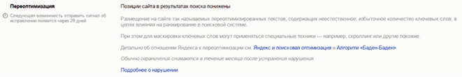 Вот так выглядит сообщение в панели Яндекс. Вебмастера при наложении фильтра: