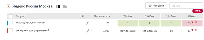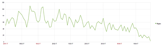 На изображении указан февраль 2016 года, далее 28 апреля 2017 года. Я не работал по проекту с февраля 2016 года, поэтому у меня не было статистики за промежуточный период, но я знаю, что сайт стабильно занимал топ-10 по основным запросам: