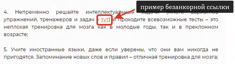 Безанкорные ссылки также могут состоять из фрагмента текста, но при это они содержат в себе только те слова, которые явно не относятся ни к каким ключевым фразам.