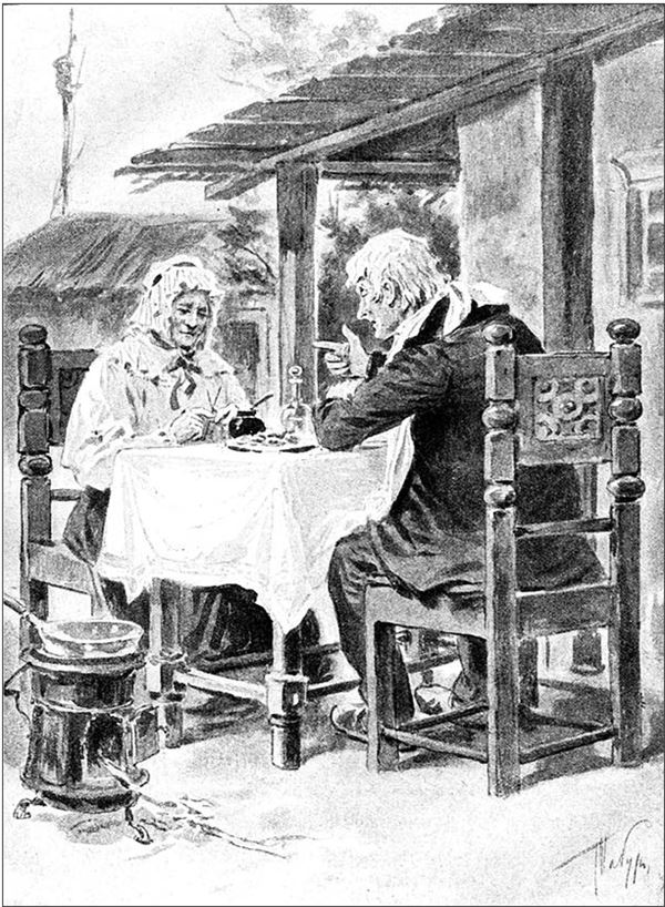 Оба старичка, по старинному обычаю старосветских помещиков, очень любили покушать. Как только занималась заря (они всегда вставали рано) и как только двери заводили свой разноголосный концерт, они уже сидели за столиком и пили кофе. Напившись кофею, Афанасий Иванович выходил в сени и, стряхнувши платком, говорил: