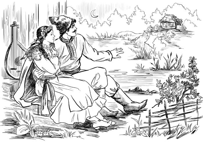 Тут он отворотился, засунул набекрень свою шапку и гордо отошёл от окошка, тихо перебирая струны бандуры. Деревянная ручка у двери в это время завертелась: дверь распахнулась со скрыпом, и девушка на поре семнадцатой весны, обвитая сумерками, робко оглядываясь и не выпуская деревянной ручки, переступила через порог. В полу-ясном мраке горели приветно, будто звёздочки, ясные очи; блистало красное коралловое монисто, и от орлиных очей парубка не могла укрыться даже краска, стыдливо вспыхнувшая на щеках её.