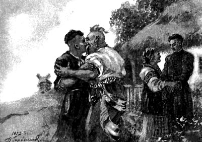 – Да он славно бьется! – говорил Бульба, остановившись. – Ей-богу, хорошо! – продолжал он, немного оправляясь, – так, хоть бы даже и не пробовать. Добрый будет козак! Ну, здорово, сынку! почеломкаемся! – И отец с сыном стали целоваться. – Добре, сынку! Вот так колоти всякого, как меня тузил; никому не спускай! А все-таки на тебе смешное убранство: что это за веревка висит? А ты, бейбас, что стоишь и руки опустил? – говорил он, обращаясь к младшему, – что ж ты, собачий сын, не колотишь меня?