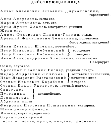 Анна Андреевна, жена его, провинциальная кокетка, еще не совсем пожилых лет, воспитанная вполовину на романах и альбомах, вполовину на хлопотах в своей кладовой и девичьей. Очень любопытна и при случае выказывает тщеславие. Берет иногда власть над мужем потому только, что тот не находится что отвечать ей; но власть эта распространяется только на мелочи и состоит в выговорах и насмешках. Она четыре раза переодевается в разные платья в продолжение пьесы.