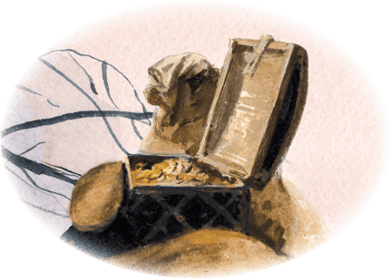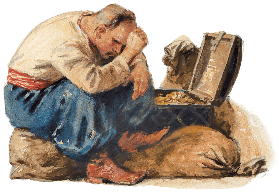 Чего ни делала Пидорка: и совещалась с знахарями, и переполох выливали, и соняшницу заваривали[4] – ничто не помогало. Так прошло и лето. Много козаков обкосилось и обжалось; много козаков, поразгульнее других, и в поход потянулось. Стаи уток еще толпились на болотах наших, но крапивянок уже и в помине не было. В степях закраснело. Скирды хлеба то сям, то там, словно козацкие шапки, пестрели по полю. Попадались по дороге и возы, наваленные хворостом и дровами. Земля сделалась крепче и местами стала прохватываться морозом. Уже и снег начал сеяться с неба, и ветви дерев убрались инеем, будто заячьим мехом. Вот уже в ясный морозный день красногрудый снегирь, словно щеголеватый польский шляхтич, прогуливался по снеговым кучам, вытаскивая зерно, и дети огромными киями гоняли по льду деревянные кубари, между тем как отцы их спокойно вылеживались на печке, выходя по временам, с зажженною люлькою в зубах, ругнуть добрым порядком православный морозец или проветриться и промолотить в сенях залежалый хлеб. Наконец снега стали таять, и щука хвостом лед расколотила, а Петро все тот же, и чем далее, тем еще суровее. Как будто прикованный, сидит посереди хаты, поставив себе в ноги мешки с золотом. Одичал, оброс волосами, стал страшен; и все думает об одном, все силится припомнить что-то; и сердится и злится, что не может вспомнить. Часто дико подымается с своего места, поводит руками, вперяет во что-то глаза свои, как будто хочет уловить его; губы шевелятся, будто хотят произнесть какое-то давно забытое слово, – и неподвижно останавливаются… Бешенство овладевает им; как полоумный, грызет и кусает себе руки и в досаде рвет клоками волоса, покамест, утихнув, не упадет, будто в забытьи, и после снова принимается припоминать, и снова бешенство, и снова мука… Что это за напасть Божия? Жизнь не в жизнь стала Пидорке. Страшно ей было оставаться сперва одной в хате, да после свыклась бедняжка с своим горем. Но прежней Пидорки уже узнать нельзя было. Ни румянца, ни усмешки: изныла, исчахла, выплакались ясные очи. Раз кто-то уже, видно, сжалился над ней, посоветовал идти к колдунье, жившей в Медвежьем овраге, про которую ходила слава, что умеет лечить все на свете болезни. Решилась попробовать последнее средство; слово за слово, уговорила старуху идти с собою. Это было ввечеру, как раз накануне Купала. Петро в беспамятстве лежал на лавке и не примечал вовсе новой гостьи. Как вот мало-помалу стал приподниматься и всматриваться. Вдруг весь задрожал, как на плахе; волосы поднялись горою… и он засмеялся таким хохотом, что страх врезался в сердце Пидорки. «Вспомнил, вспомнил!» – закричал он в страшном веселье и, размахнувши топор, пустил им со всей силы в старуху. Топор на два вершка вбежал в дубовую дверь. Старуха пропала, и дитя лет семи, в белой рубашке, с накрытою головою, стало посреди хаты… Простыня слетела. «Ивась!» – закричала Пидорка и бросилась к нему; но привидение все с ног до головы покрылось кровью и осветило всю хату красным светом… В испуге выбежала она в сени; но, опомнившись немного, хотела было помочь ему; напрасно! дверь захлопнулась за нею так крепко, что не под силу было отпереть. Сбежались люди; принялись стучать; высадили дверь: хоть бы душа одна. Вся хата полна дыма, и посередине только, где стоял Петрусь, куча пеплу, от которого местами подымался еще пар. Кинули