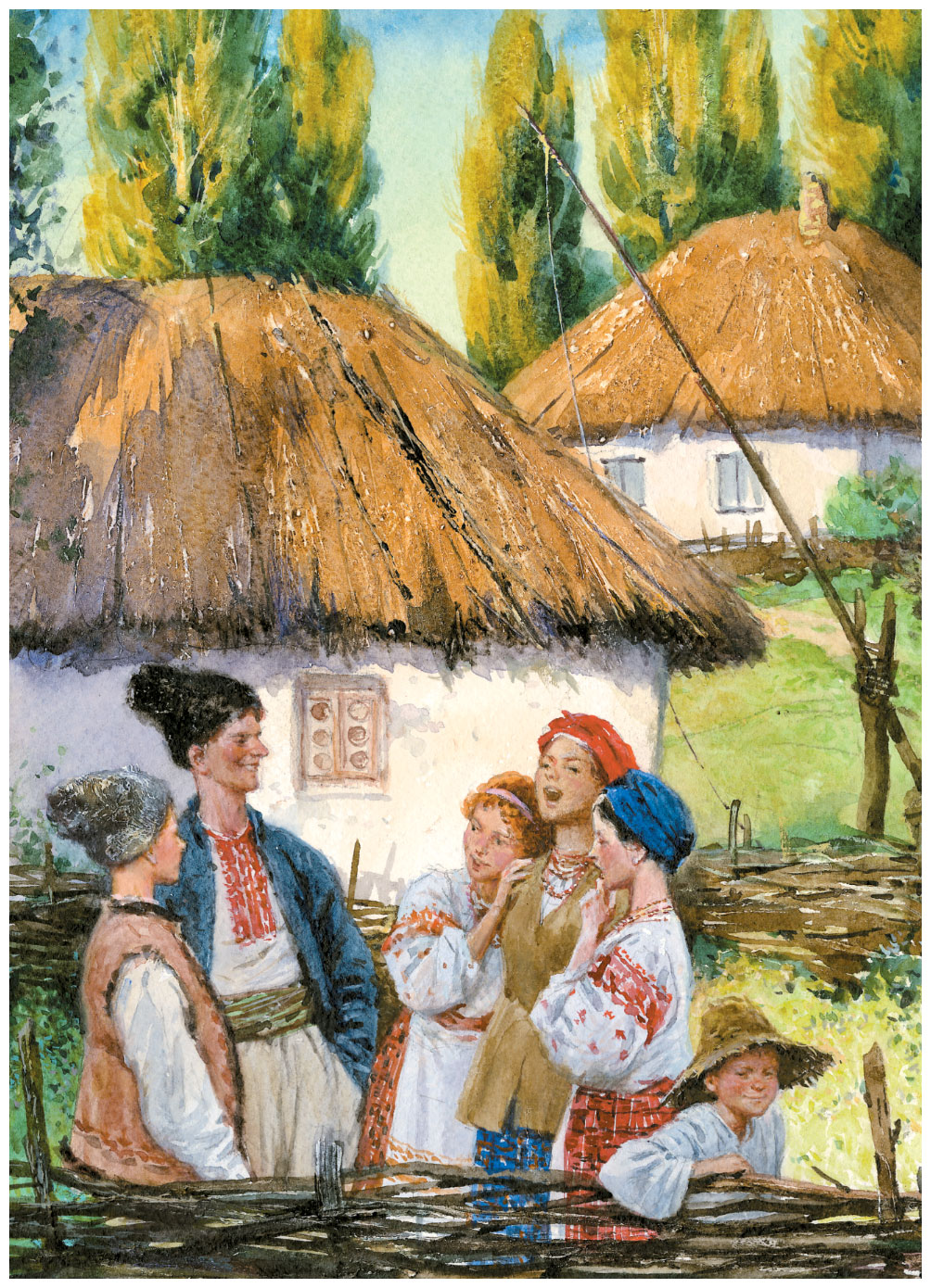 – О, не дрожи, моя красная калиночка! Прижмись ко мне покрепче! – говорил парубок, обнимая ее, отбросив бандуру, висевшую на длинном ремне у него на шее, и садясь вместе с нею у дверей хаты. – Ты знаешь, что мне и часу не видать тебя горько.