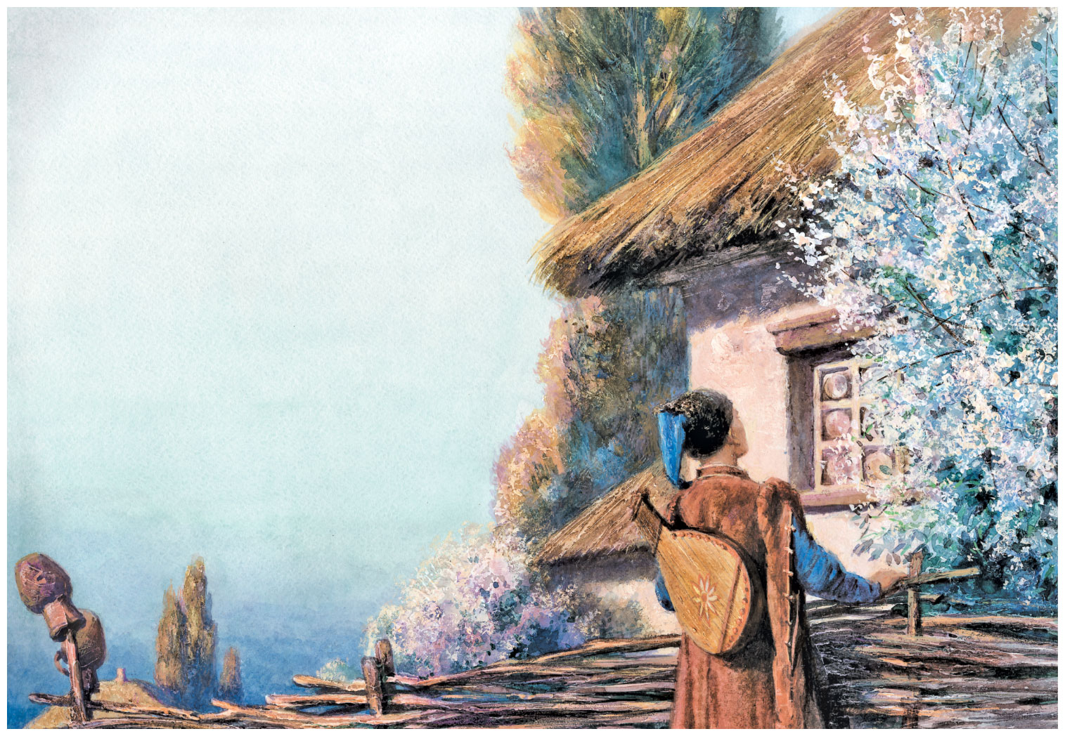 Тут он отворотился, насунул набекрень свою шапку и гордо отошел от окошка, тихо перебирая струны бандуры. Деревянная ручка у двери в это время завертелась: дверь распахнулась со скрыпом, и девушка на поре семнадцатой весны, обвитая сумерками, робко оглядываясь и не выпуская деревянной ручки, переступила через порог. В полуясном мраке горели приветно, будто звездочки, ясные очи; блистало красное коралловое монисто, и от орлиных очей парубка не могла укрыться даже краска, стыдливо вспыхнувшая на щеках ее.