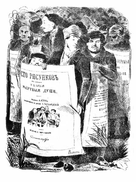 Гравюра, как техника живая и четкая, может кое-что внести в художественный образ самой книги. Этого и испугался Николай Васильевич Гоголь. Гоголь сел за приготовление мягкой обложки для поэмы, изданной в 1842 году, и сам нарисовал оригинал. На обертке под несущимся быстро тарантасом изображены: с левой стороны часть деревни, с правой – верстовой столб. Между ними с той и другой стороны бутылки с рюмками и бокалами, закуски в виде рыб на блюде; солонка, бутылка сверху как бы венчает этот ряд изображений, которому внизу соответствуют также бутылки с бокалами и блюдо с большим осетром и мелкими рыбками, – как на трапезе у полицмейстера, к которому пристроился Собакевич. Изображений живых людей немного – только два: на правом поле пьяный мужичок, пляшущий подбоченившись с чаркой в руке, и танцующая на балу пара. Зато эмблемы смерти в обилии рассыпаны по всей картине: скелеты, скелеты и черепа, черепа… это же реквием по Мертвым Душам, путь к их бессмертию, а рядом дураки, мерзкие дороги и вечно пьяные мужики! О, Русь! Ну а гравер Е. Е. Бернардский был вынужден издать рисунки А. А. Агина отдельным альбомом в 1846 году, т. к. писатель категорически возражал против иллюстрирования его поэмы. За несколько месяцев до этого гравер предлагал Гоголю 1500 рублей серебром за право издать его поэму с иллюстрациями Агина. В письме к П. А. Плетневу Гоголь отклонил это предложение. Отклонил по ряду соображений, между прочим и потому, что он – «враг всяких политипажей и модных выдумок». Книга, по его глубокому убеждению, должна сама прокладывать себе путь к читателю, прокладывать своим содержанием, которое не следует «подслащивать этим кондитерством» – иллюстрациями (Письмо от 20 марта 1846 г.).