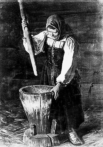 «…как мельничная ступа…» Мельничная ступа – большая деревянная ступа (высотой до 80 см), сделанная из выдолбленной колоды, в которой с помощью тяжелого песта (толкача) отделяли оболочку и перемалывали зерна пшеницы, ячменя, проса, гречихи и т. д. В сказках именно такая ступа считалась средством передвижения Бабы-яги.
