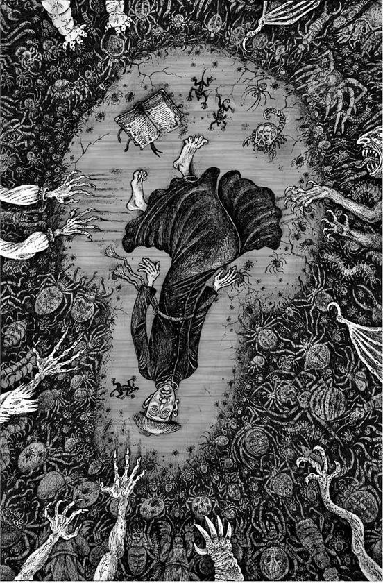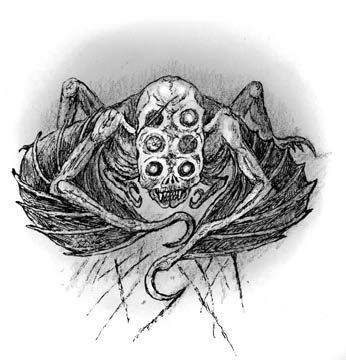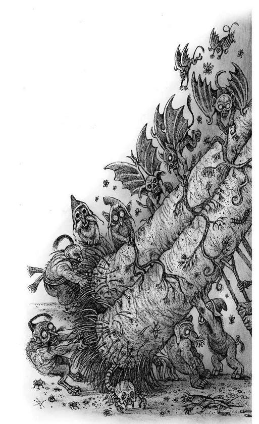 У Хомы вышел из головы последний остаток хмеля. Он только крестился да читал как попало молитвы. И в то же время слышал, как нечистая сила металась вокруг его, чуть не зацепляя его концами крыл и отвратительных хвостов. Не имел духу разглядеть он их; видел только, как во всю стену стояло какое-то огромное чудовище в своих перепутанных волосах, как в лесу; сквозь сеть волос глядели страшно два глаза, подняв немного вверх брови. Над ним держалось в воздухе что-то в виде огромного пузыря, с тысячью протянутых из середины клещей и скорпионьих жал. Черная земля висела на них клоками. Все глядели на него, искали и не могли увидеть его, окруженного таинственным кругом.