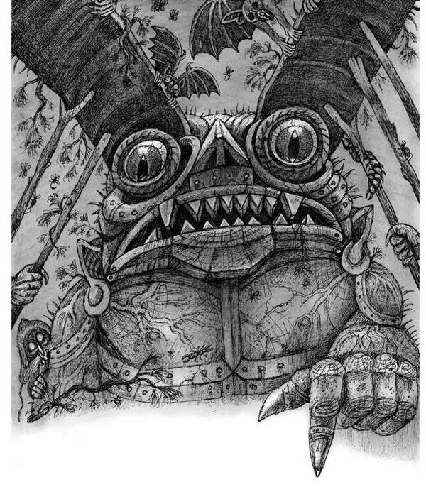 И вдруг настала тиши на в церкви; послышалось вдали волчье завыванье, и скоро раздались тяжелые шаги, звучавшие по церкви; взглянув искоса, увидел он, что ведут какого-то приземистого, дюжего, косолапого чело века. Весь был он в черной земле. Как жилистые, крепкие кор ни, выдавались его засыпанные землею ноги и руки. Тяжело ступал он, поминутно оступаясь. Длинные веки опущены были до самой земли. С ужасом заметил Хома, что лицо было на нем железное. Его привели под руки и прямо поставили к тому месту, где стоял Хома.