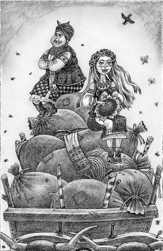 Одиноко в стороне тащился на истомленных волах воз, наваленный мешками, пенькою, полотном и разною домашнею поклажею, за которым брел, в чистой полотняной рубашке и за пачканных полотняных шароварах, его хозяин. Ленивою рукой обтирал он катившийся градом пот со смуг лого лица и даже капавший с длинных усов, напудренных тем неумолимым парикмахером, который без зову является и к красавице и к уроду и насильно пудрит несколько тысяч уже лет весь род человеческий. Рядом с ним шла привязанная к возу кобыла, смиренный вид которой обличал преклонные лета ее. Много встречных, и особливо молодых парубков, брались за шапку, поравнявшись с нашим мужиком. Однако ж не седые усы и не важная поступь его заставляли это делать; стоило только поднять глаза немного вверх, чтоб увидеть причину такой почтительности: на возу сидела хорошенькая дочка с круглым личиком, с черными бровями, ровными дугами поднявшимися над светлыми карими глазами, с беспечно улыбавшимися розовыми губками, с повязанными на голове красными и синими лентами, которые, вместе с длинными косами и пучком полевых цветов, богатою короною покоились на ее очаровательной головке. Все, казалось, занимало ее; все было ей чудно, ново… и хорошенькие глазки беспрестанно бегали с одного предмета на другой. Как не рассеяться! в первый раз на ярмарке! Девушка в осьмнадцать лет в первый раз на ярмарке!.. Но ни один из прохожих и проезжих не знал, чего ей стоило упросить отца взять с собою, который и душою рад бы был это сделать прежде, если бы не злая мачеха, выучившаяся держать его в руках так же ловко, как он вожжи своей старой кобылы, тащившейся, за долгое служение, теперь на продажу. Неугомонная супруга… но мы и позабыли, что и она тут же сидела на высоте воза, в нарядной шерстяной зеленой кофте, по которой, будто по горностаевому меху, нашиты были хвостики, красного только цвета, в богатой плахте, пестревшей, как шахматная доска, и в ситцевом цветном очипке, придававшем какую-то особенную важность ее красному, полному лицу, по которому проскальзывало что-то столь неприятное, столь дикое, что каждый тотчас спешил перенести встревоженный взгляд свой на веселенькое личико дочки.