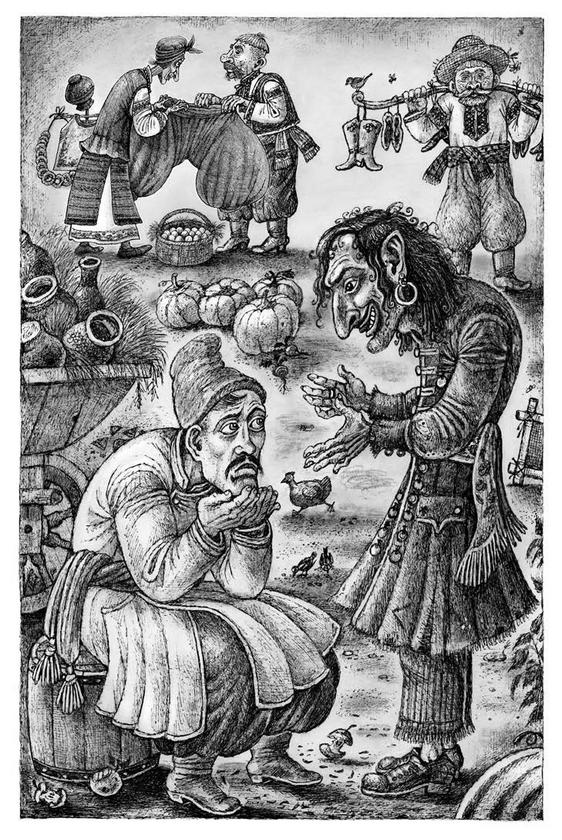 Такою роскошью блистал один из дней жаркого августа тысячу восемьсот… восемьсот… Да, лет тридцать будет назад тому, когда дорога, верст за десять до местечка Сорочинец, кипела народом, поспешавшим со всех окрестных и дальних хуторов на ярмарку. С утра еще тянулись нескончаемою вереницею чумаки с солью и рыбою. Горы горшков, закутанных в сено, медленно двигались, кажется, скучая своим заключением и темнотою; местами только какая-нибудь расписанная ярко миска или макитра хвастливо выказывалась из высоко взгроможденного на возу плетня и привлекала умиленные взгляды поклонников роскоши. Много прохожих поглядывало с завистью на высокого гончара, владельца сих драгоценностей, который медленными шагами шел за своим товаром, заботливо окутывая глиняных своих щеголей и кокеток ненавистным для них сеном.