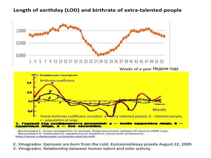 It is possible that this effect of cereal yield growth is related to the improving farming techniques and decreasing gravity-spin cosmic energies over the measured time, i.e. the unique combination of these two factors – trends of cosmic energy changes and modern economic development. Usually, when encountering such coincidences and self-explanations the analysis of such correlations that "kill the science" is abandoned. But we knew something more based on previous studies. In various scientific fields the most unexpected correlations with the Earth's rotational velocity were discovered. When looking at a graph or a table one can see the matching trends with the Earth's rotational velocity that they reflect. These are true miracles.