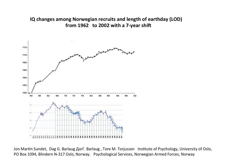 A relationship was identified between the Earth's axial rotational velocity and the indicators of intelligence testing, as well as IQ change of the subjects.