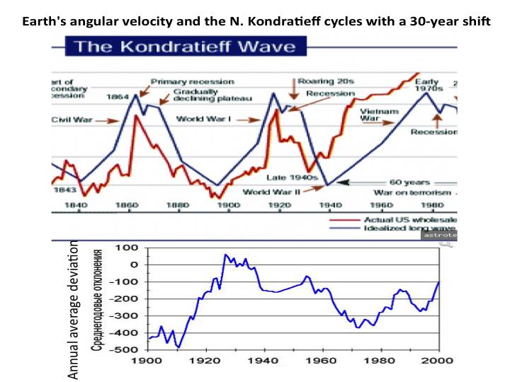 There is an agreement between the Kondratieff cycles and the change cycles of the Earth's rotational velocity.