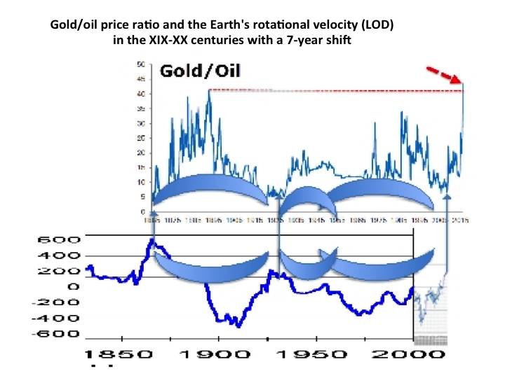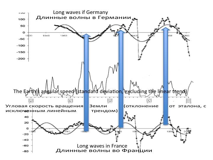 At the same time the main economic indicator of the USA – CPI (consumer price index), has value surges on the graph peaks of the Earth's rotational velocity change. But for every passing century this fit "diverges": from 1 year in the early 19th century up to 6-7 years nowadays.